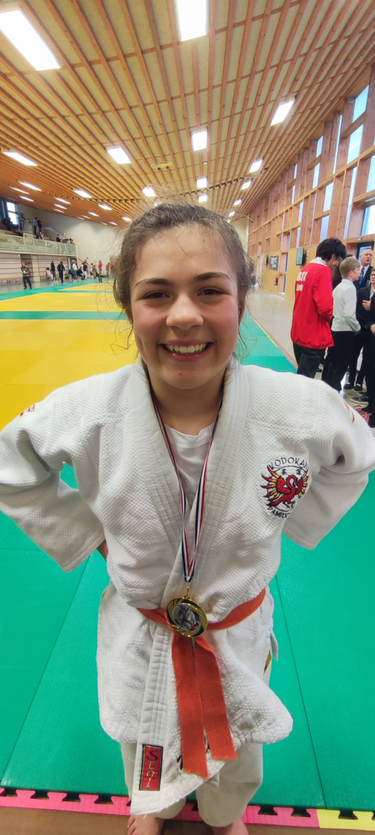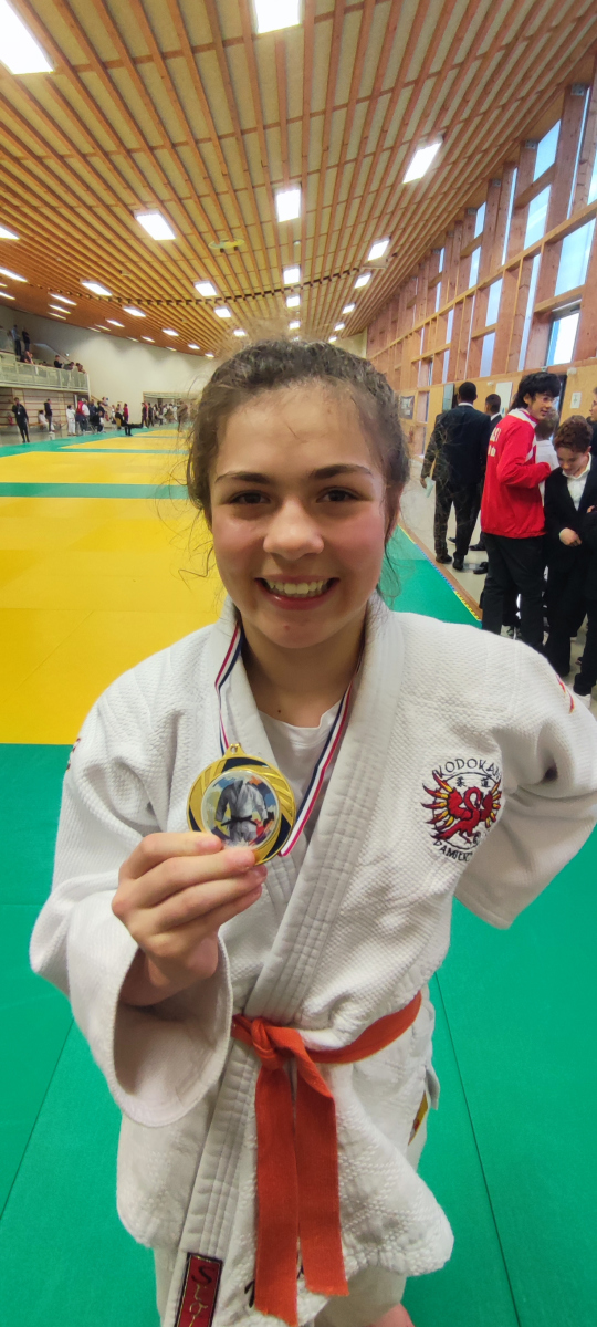 En – 63 Kg Méline en pleine croissance elle aussi est monté dans la catégorie au-dessus et comme son copain Nolan elle s’y est bien retrouvé. Elle est sortie première de sa poule pour entamer la phase finale. Elle gagne sa demi-finale et se retrouve en finale contre une adversaire qu’elle a déjà battu en poule. Le conseil du coach : “…ce n’est pas parce que tu l’as battu avant que tu as déjà gagné le combat …Elle va vouloir avoir sa revanche et a dû analyser avec son coach tes failles…”. Début du combat “chaotique” Méline se fait submerger par son adversaire plus grande, tombe au sol et se fait immobiliser mais c’était sans compter sur la combativité de Méline qui dans son effort réussi a arrêter le temps de l’immobilisation à la toute dernière seconde (19 secondes d’immobilisation à 1 seconde de la défaite). Le temps de se remettre en place pour reprendre le combat, d’écouter les consignes (conseils) du coach et Méline a cette fois repris l’initiative et en replaçant mieux son bras et sa main dans le dos de son adversaire passe un superbe O Goshi qui conclut le combat sur Ipon. Méline remporte donc la première place bien méritée.
