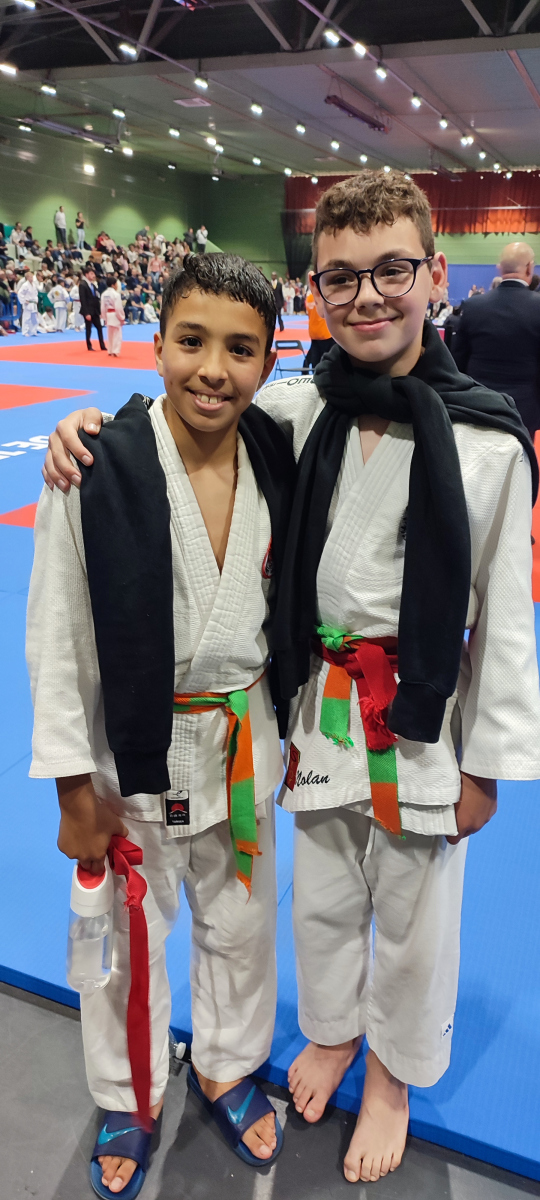Début des combats pour les garçons sur deux tatamis cote à cote. Les deux copains se soutiennent, s’échauffent ensemble et essaient de rompre la mécanique du stress.